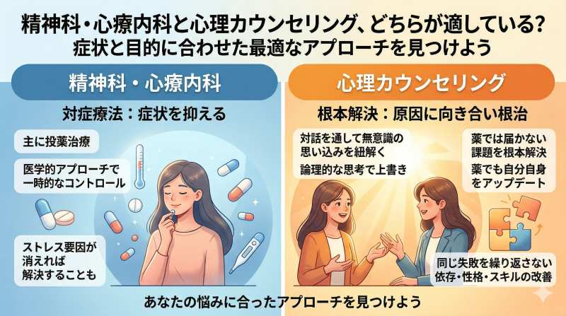 一時的な急性の不調であれば精神科・心療内科が適していますが、長年続いている悩みや自分自身の思考パターンが原因となっている場合は、心理カウンセリングが優位です。