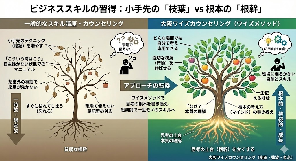 一般的なビジネス講座やカウンセリングは、いわば「木の枝葉(テクニック)」を整えるものです。しかし、幹や根っこ(根本の思考)が細ければ、枝葉はすぐに枯れてしまいます。